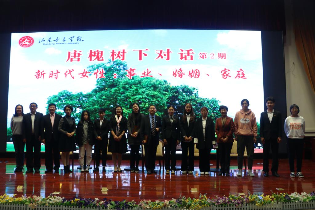 10月24日,第二期“唐槐树下对话——新时代女性:事业、婚姻、家庭”在我校隆重举行。校党委书记郭翠芬出席对话会并为与会嘉宾颁发“唐槐树下”特邀嘉宾纪念牌。对话会由中国妇女研究会副会长、厦门大学博士生导师、山东女子学院特聘教授叶文振主持,山东大学哲学与社会发展学院副院长、社会学系教授、博士生导师、移民研究所所长宋全成,湖南省妇女联合会副主席(挂职)、湖南大学法学院教授、博士生导师曹薇薇,福建江夏学院社会工作系主任、海峡两岸女性研究中心主任王慧博士,山东女子学院文化传播学院教师、知名作家、中国作家协会会员陈亮等应邀参加对话。对话会由学校妇女研究与发展中心、校团委主办。