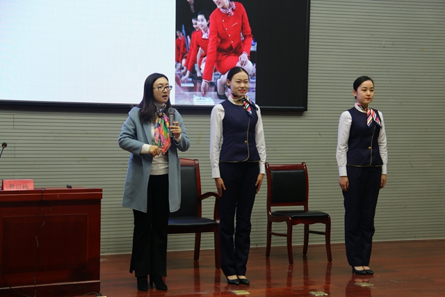 报告会上,刘莹老师从大学生的面部形象礼仪,服装搭配礼仪,仪态礼仪,语言礼仪,校园文明礼仪,接待礼仪六个方面,用生动语言、鲜活事例、精美的图片,为同学们上了一堂精彩、实用的礼仪课,同学们受益匪浅。同时,现场邀请到两位空乘专业的优秀学生代表为大家示范了坐姿、走姿、蹲姿等基本规范动作,使大家对大学生文明仪态有了更为直观的了解和学习。